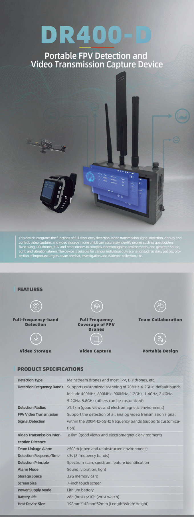 This device integrates the functions of full-frequency detection, video transmission signal detection, display and control, video capture, and video storage in one unit. It can accurately identify drones such as quadcopters, fixed-wing, DIY drones, FPV and other drones in complex electromagnetic environments, and generate sound, light, and vibration alarms. The device is suitable for various individual duty scenarios such as daily patrols, protection of important targets, team combat, investigation and evidence collection, etc.